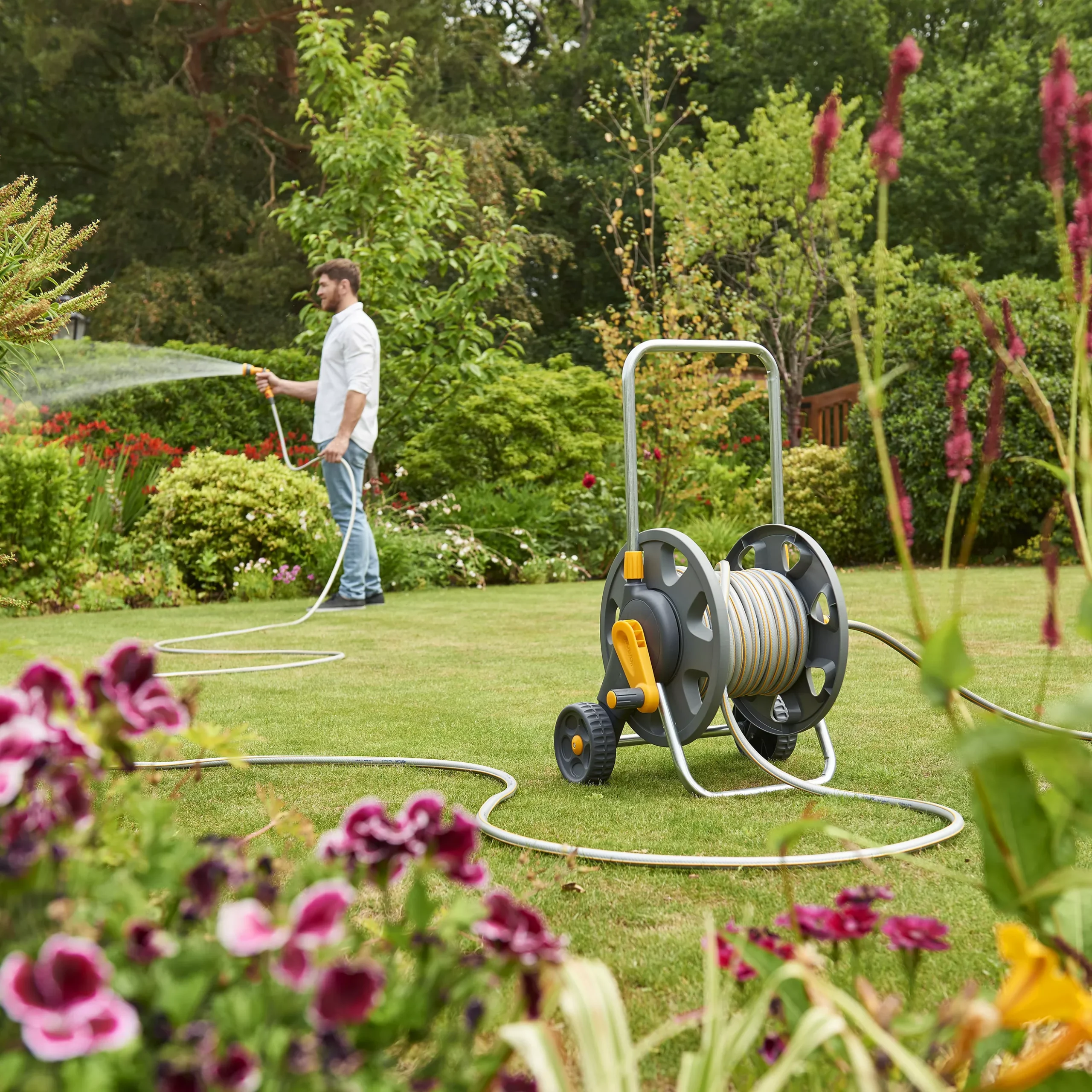 A freestanding, wheeled hose cart with an adjustable handle for easy movement around the garden. Supplied with hose and fittings
